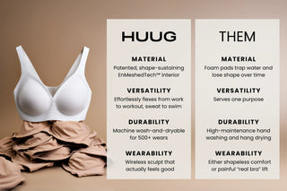 Traditional foam pads can shift, absorb moisture, and break down with repeated washing, especially in the dryer. Huug uses a bonded mesh cup that stays in place and maintains consistent support through wear, washing, and drying.